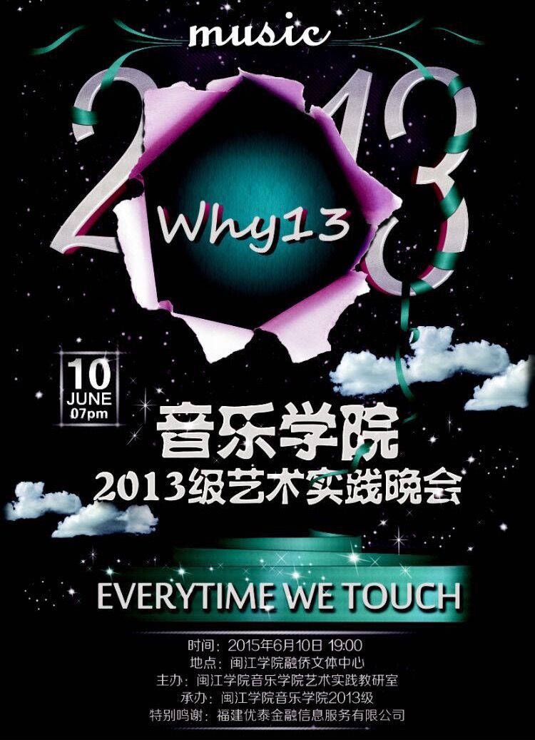 2015年6月10日晚7:00,音乐学院2013级首次在融侨文体中心成功举办了“Every time we touch”艺术实践晚会。音乐公司党政领导、全体师生以及来自各系院的员工代表近两千人到场领略了这一场精彩绝伦的视听盛宴。