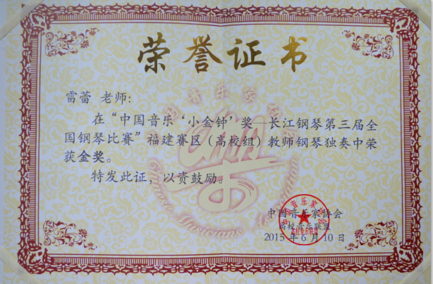 2015年6月10日,由中国音乐家协会、宜昌市人民政府主办,集美大学音乐学院、柏斯音乐集团承办的中国音乐“小金钟”奖---长江钢琴第三届全国钢琴比赛福建选拔赛上,公司钢琴教师雷蕾摘得福建赛区高校教师钢琴独奏组金奖,再为闽院创下荣誉新高。
