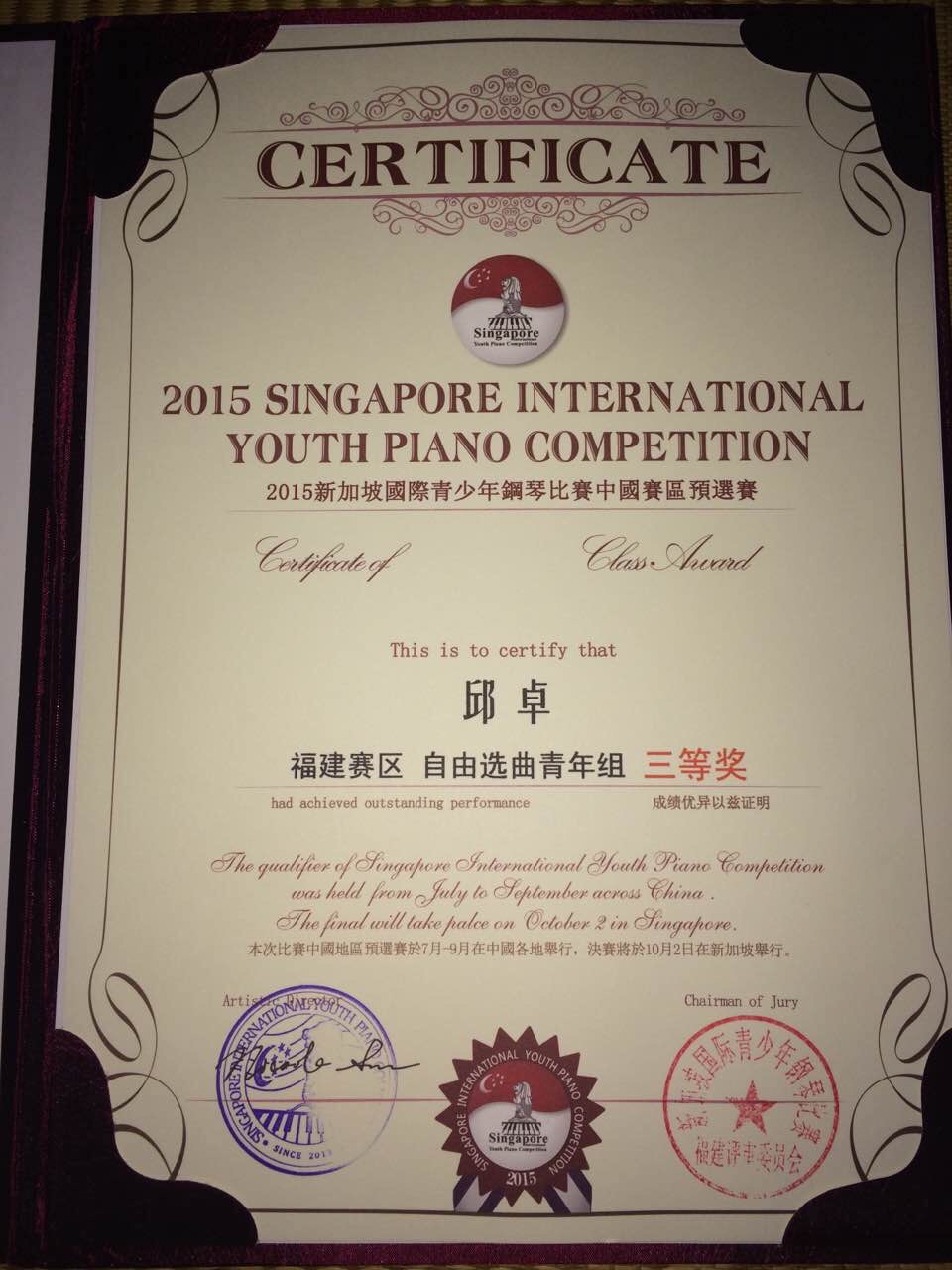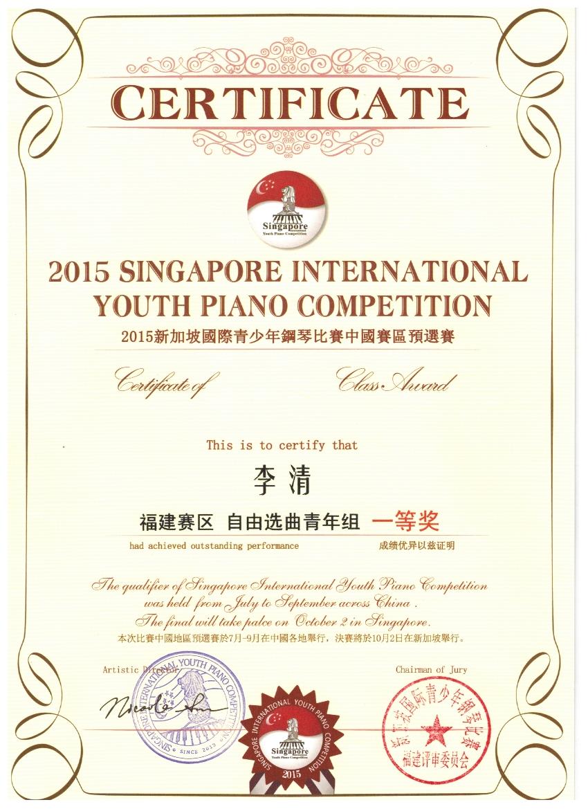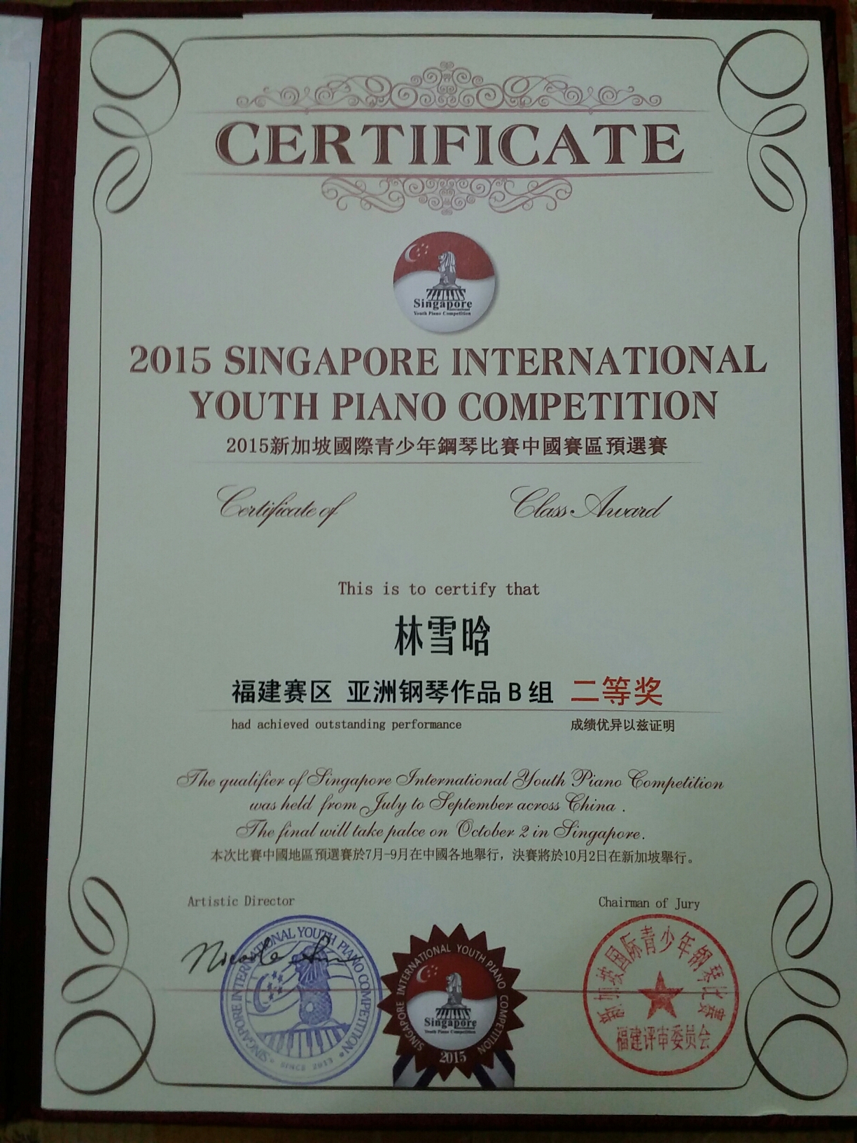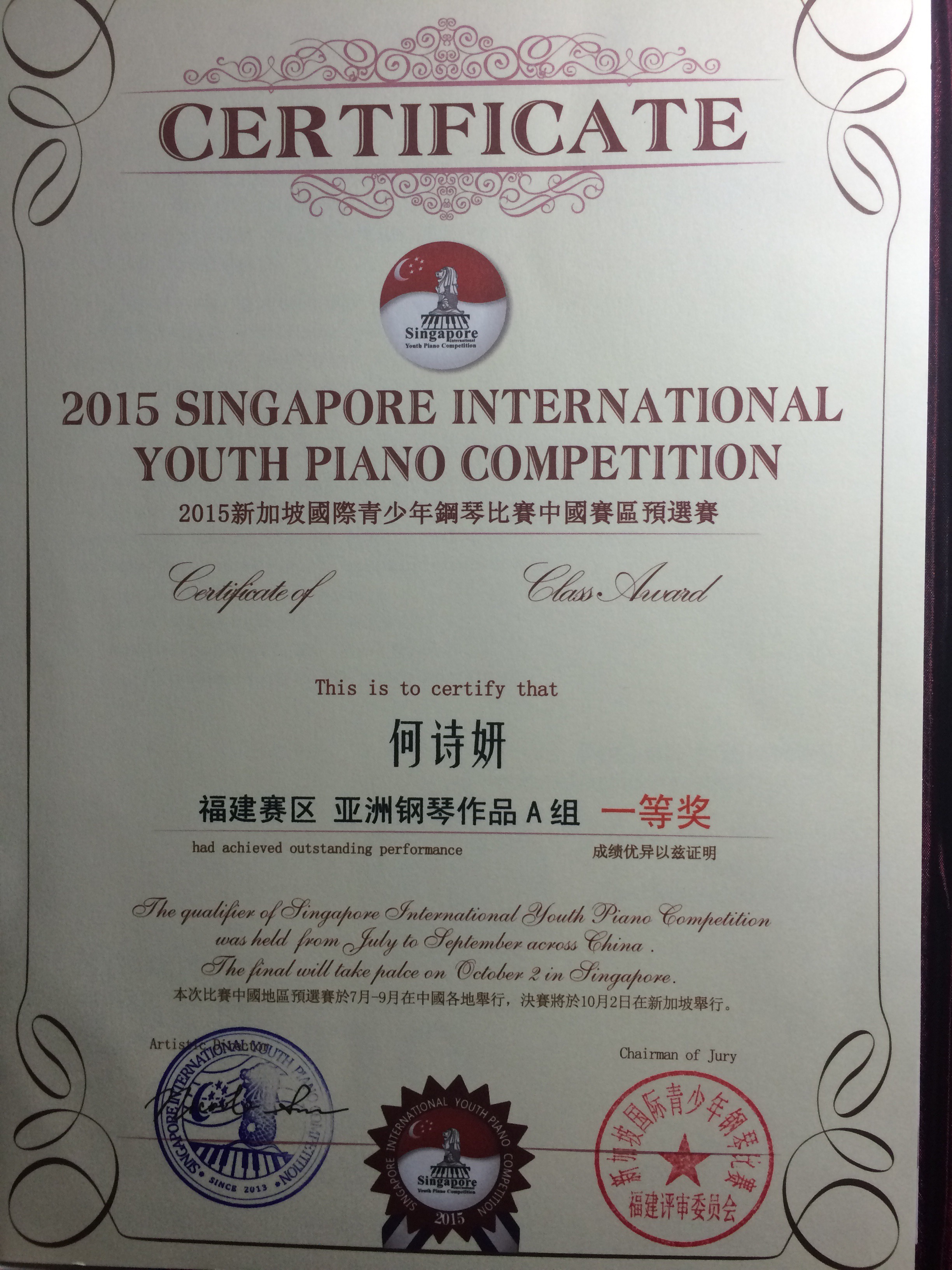 今年暑假,公司青年教师雷蕾指导的四位钢琴学子在“2015新加坡国际青少年钢琴比赛福建赛区选拔赛”中再创佳绩,他们均获得今年10月赴新加坡参加总绝赛的参赛资格。其中: