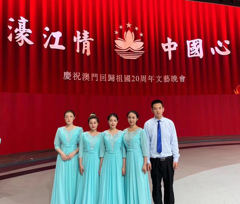 12月20日,澳门回归祖国20周年文艺晚会隆重举行,在本次晚会上,必赢76net5名同学随福建省歌舞剧院演员一起的参加了本次文艺晚会演出,他们担任了《我和我的祖国》 《七子之歌》 《伶仃洋之恋》 《赞美新中国》 《天耀中华》 《扬帆未来》 《莲成一家》 《乘风破浪再出发》 《歌唱祖国》九首歌的合唱任务。