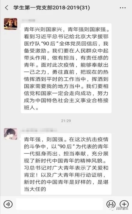 16级员工党员张可心:总书记的深情寄语和殷切嘱托,激励着我们广大青年,在疫情防控的斗争面前,以“90后”为代表的青年一代挺身而出、担当奉献。他们不畏艰险、冲锋在前,彰显了新时代中国青年的蓬勃力量,我们青年学子理当肩负起时代赋予的使命与责任,与祖国同命运,与人民共患难,为夺取抗击疫情斗争的胜利作出应有的贡献。