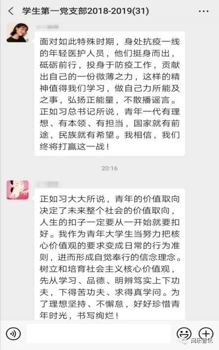 在学习了习近平总书记给北京大学援鄂90后党员的回信后,音乐学院员工第一党支部的员工党员们结合着党的十八大以来习近平总书记对广大青年学子寄语,展开了热烈的讨论: