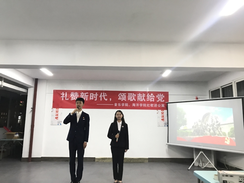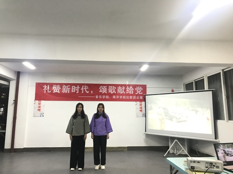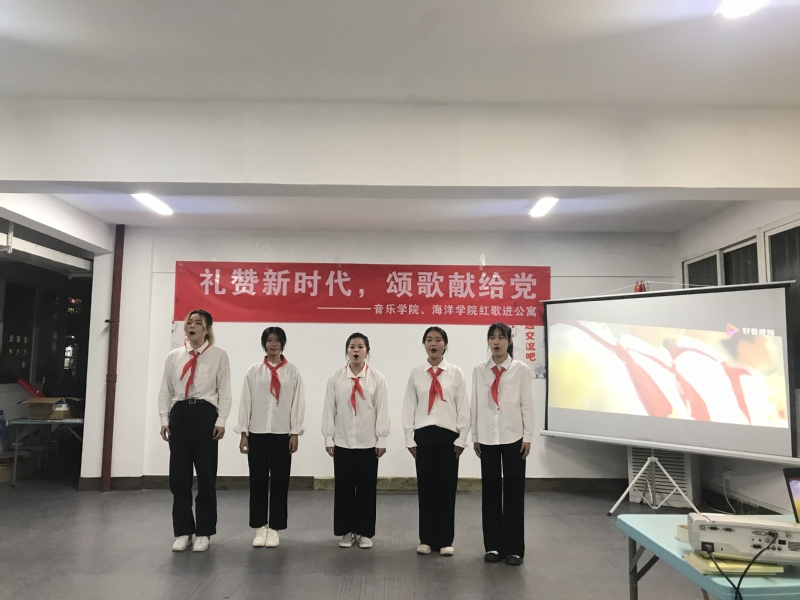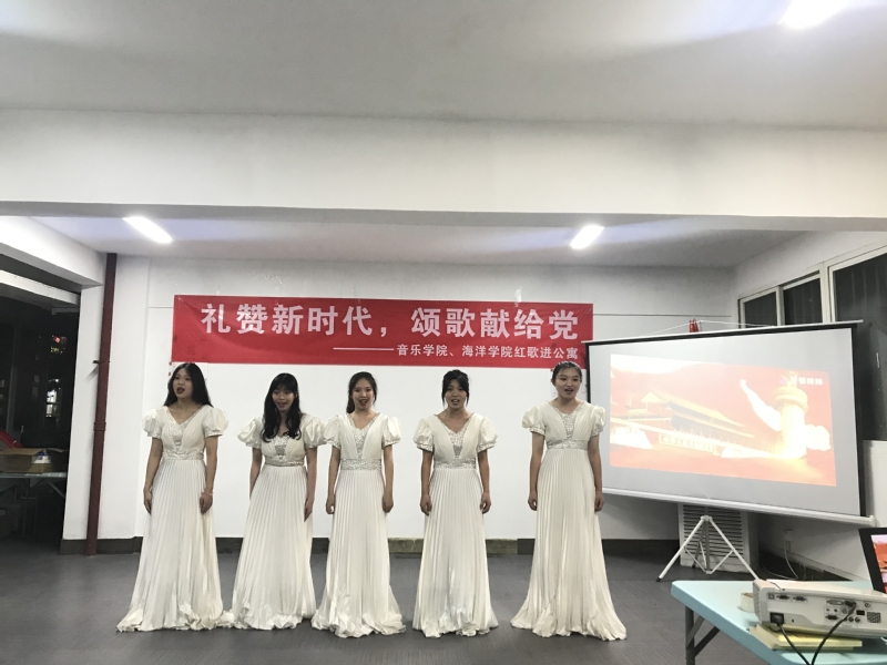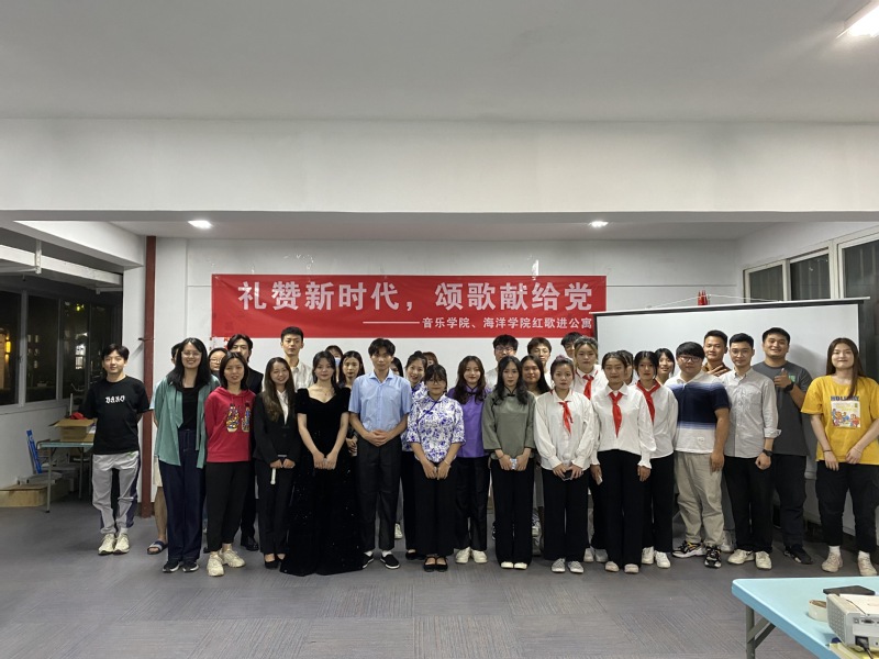6月1日晚,音乐学院与海洋学院合作在二区二易起学吧开展以“礼赞新时代·颂歌献给党”为主题的百首红歌进公寓活动。师生代表50余人观看演出,活动受到员工欢迎和好评。