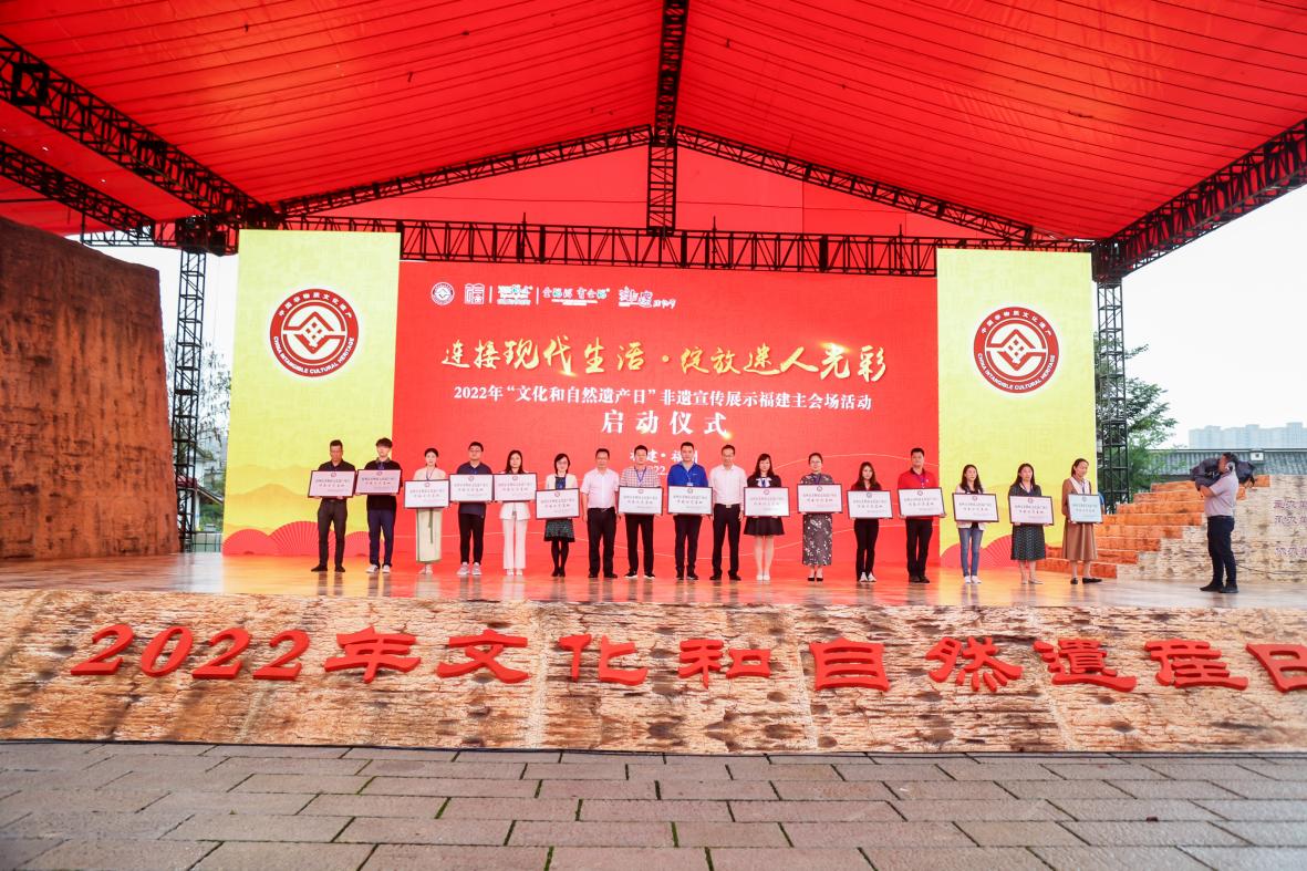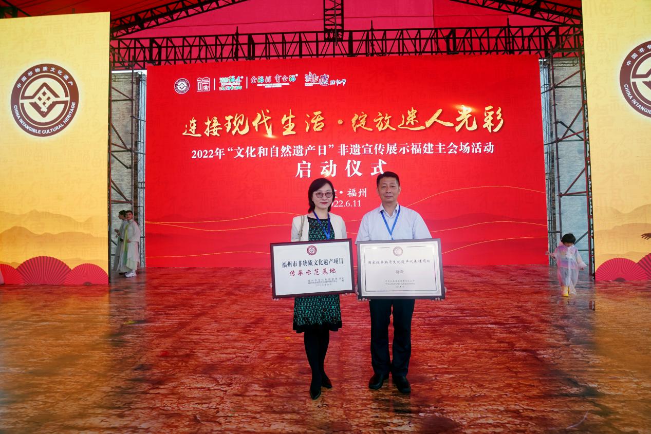 6月11日,由福建省文化和旅游厅、福州市人民政府主办的2022年“文化和自然遗产日”非遗宣传展示福建主会场活动启动仪式在福州市晋安区新店古城遗址公园举行,拉开了2022年“文化和自然遗产日”福建非遗宣传展示系列活动的序幕。启动仪式上,领导和嘉宾为第五批国家级非遗代表性项目、第七批省级非遗代表性项目、福州市级非遗传承示范基地授牌。公司副经理刘淘受邀参加授牌仪式。