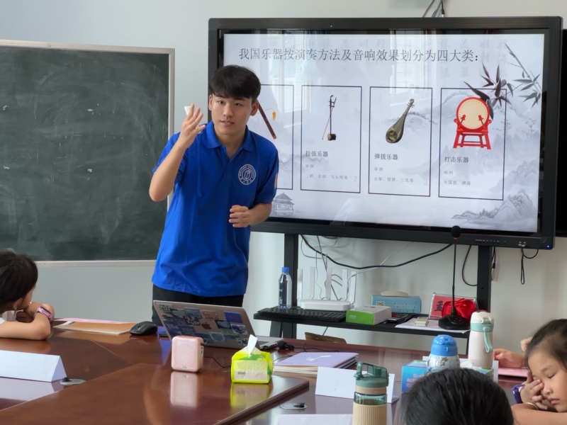中国传统乐器,作为中华民族音乐的主要载体,蕴含着深厚的传统文化底蕴、人文精神和较高的审美价值。在传统乐器小课堂中,支教队员马文杰带领小朋友们观看民乐演奏视频,帮助他们建立起对民乐的初印象。而后深入浅出地介绍每种传统乐器的发展历史、音调音色和外貌特征,让小朋友们了解到各种民族乐器的差异。在素质教育大力发展的今天,支教队员们在音乐课堂融入民族音乐,共同感受我国传统文化的内涵和力量。