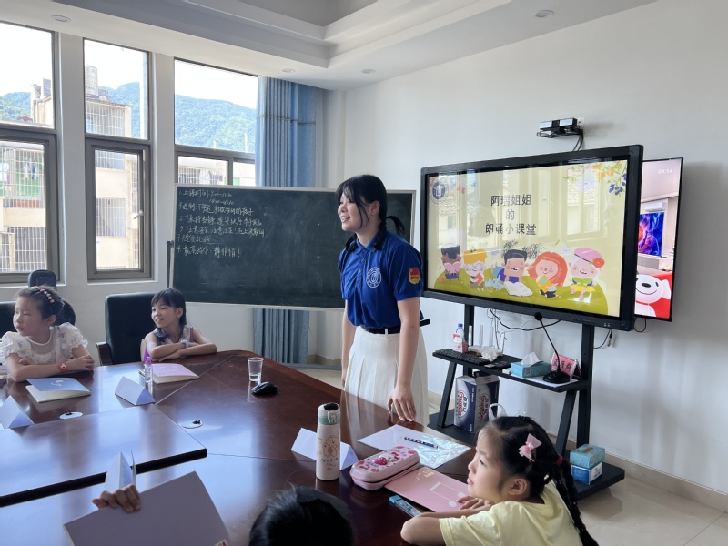 朗诵教育课堂中,为提高孩子们的思维拓展能力、情感表达能力以及想象力,支教队员王欣瑞开展了故事小课堂,让孩子们以角色扮演的形式上台朗诵,演绎生动的故事,表达内心的情感。通过有趣的授课方式,使得小朋友们积极参与到互动当中,感受到朗诵的魅力,同时也将大道理和小故事融为一体,让小朋友更加直接地感悟到故事中蕴含的哲理。