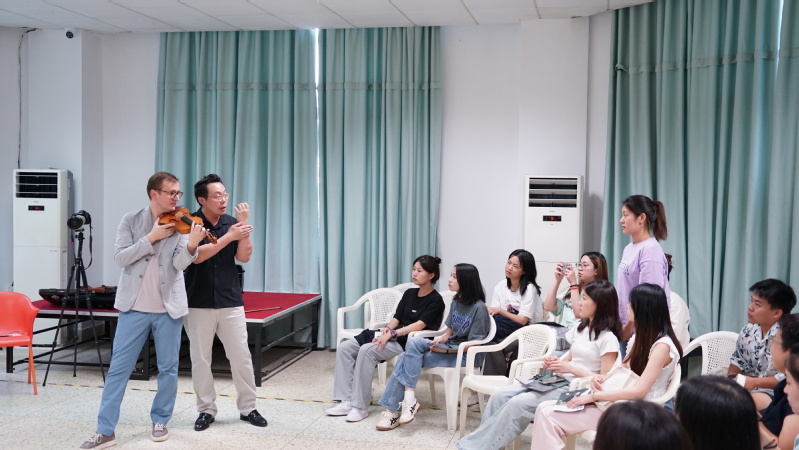 在互动环节,同学们纷纷向两位艺术家提出“在快速演奏中大拇指如何放松?”“如何提高演奏速度?”等问题,大师都耐心予以回答,并进行即兴演奏《巴赫 小提琴无伴奏solo