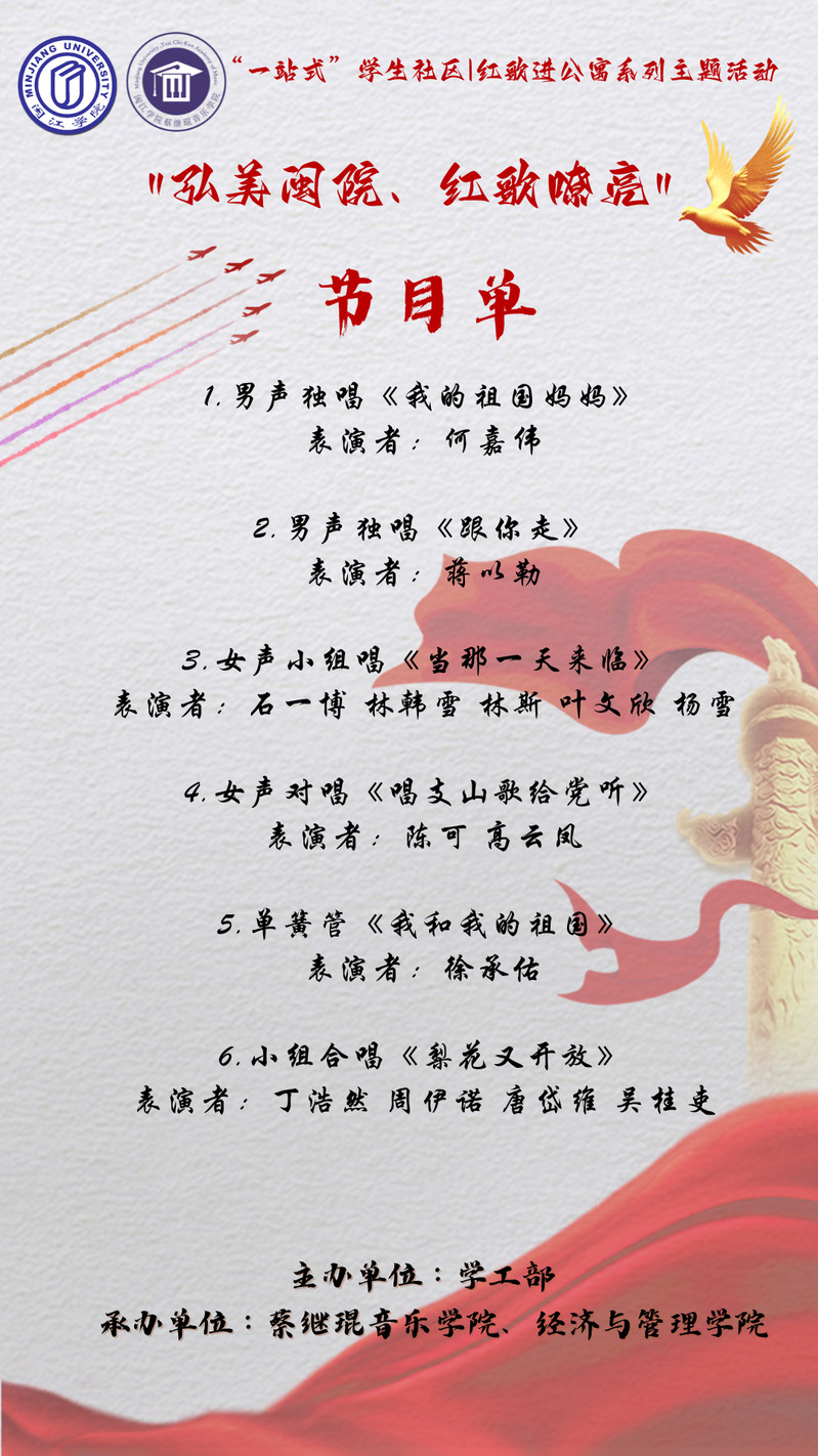 公司学工部宿舍管理与服务中心联合必赢76net、经济与管理学院将于2023年12月20日下午14:30在三区三易起学吧举行“弘美闽院、红歌嘹亮”音乐学院红歌进公寓主题活动,欢迎全校师生前来观看。