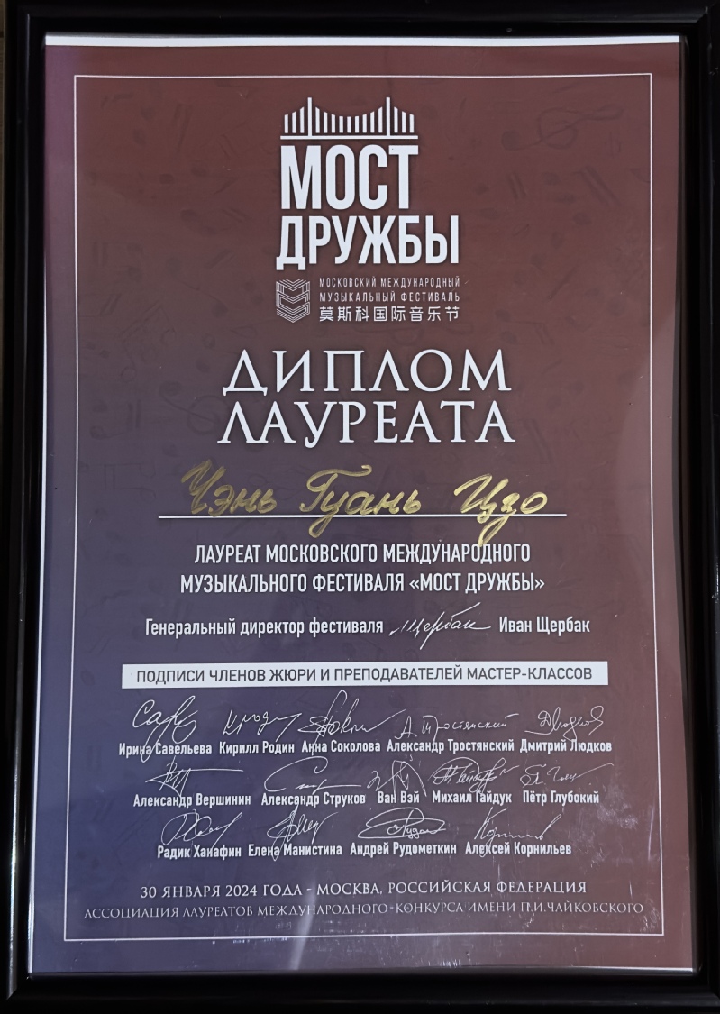 公司张铠麟老师带领团队参赛,经过层层选拔,公司林子钧、陈冠佐二位同学获资格前往莫斯科参加总决赛。经过激烈的比赛后,喜讯传来:公司员工林子钧荣获弦乐组第三名,陈冠佐荣获管乐组优胜奖,他们用自己出色的表现,在高手如云的大赛中展现了公司音乐学子的风采。