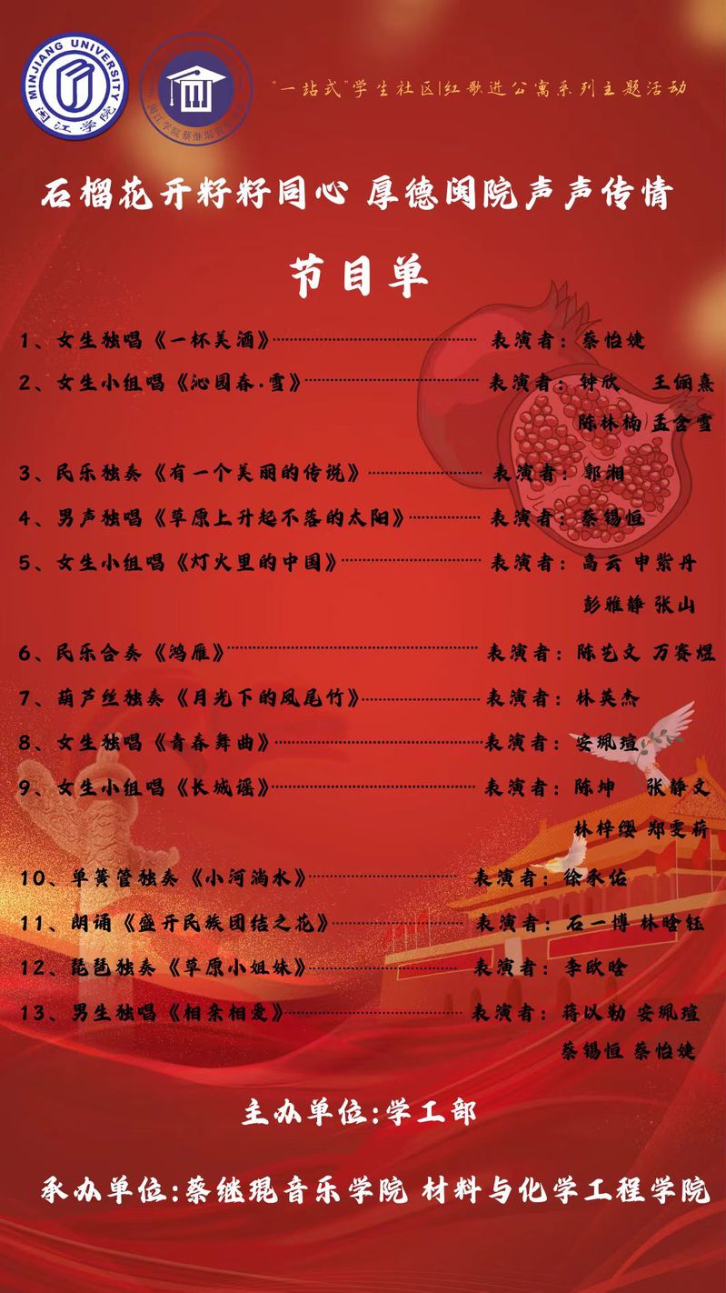 为了深入贯彻党的二十大精神,弘扬伟大建党精神,让红色文化生根发芽,激发同学们的爱国热情,凝聚奋进力量,准确把握和全面贯彻我们党关于加强和改进民族工作的重要思想,以铸牢中华民族共同体意识为主线,坚定不移走中国特色解决民族问题的正确道路,校学工部联合必赢76net、材料与化学工程学院将于2024年4月24日下午14:00在三区三易起学吧举行“石榴花开籽籽同心,厚德闽院声声传情”红歌进公寓主题活动。