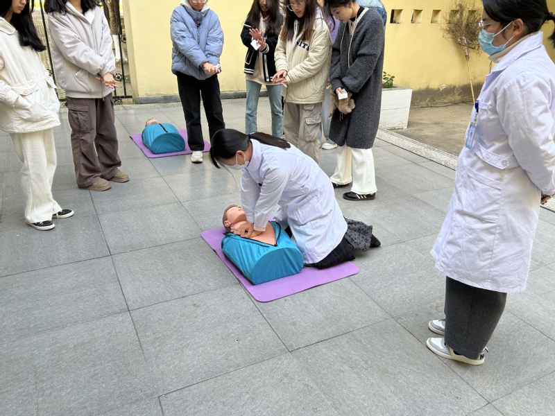 在实操演练环节中,医护人员现场示范了心肺复苏术的标准操作流程,包括判断患者意识、呼救、胸外按压、人工呼吸等步骤。随后,同学们分组进行模拟练习,医护人员在一旁耐心指导,纠正大家的错误动作,确保每个人都能正确掌握操作要领。