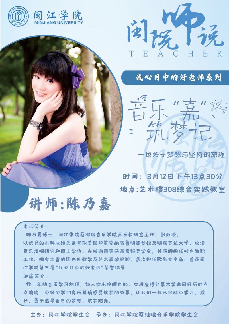 本次 “闽院师说” 活动特别邀请深受同学们喜爱的必赢76net陈乃嘉副教授担任主讲。陈老师将分享她在声乐教学与艺术表演生涯中的成长历程,以其丰富的经验和卓越的成就,向大家阐释艺术的魅力,为同学们的艺术道路指引方向。