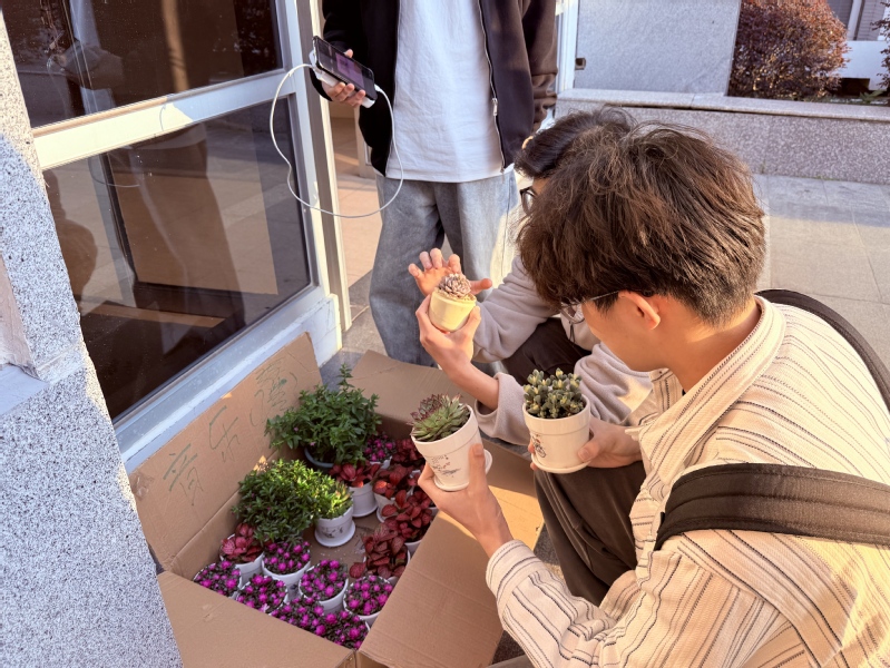 活动现场精心布置了多肉、金线莲、满天星等90盆绿植,每盆均附专属养护指南。员工们有序挑选心仪盆栽,或认真研读种植技巧,或与同伴探讨摆放创意;不少同学手持绿植在花圃前合影留念,记录“领养”瞬间。短短四小时,所有绿植被认领一空。“这是我第一次养多肉,看着它一点点长大,感觉自己也多了一份牵挂和期待。”2023级音乐学专业员工分享道。