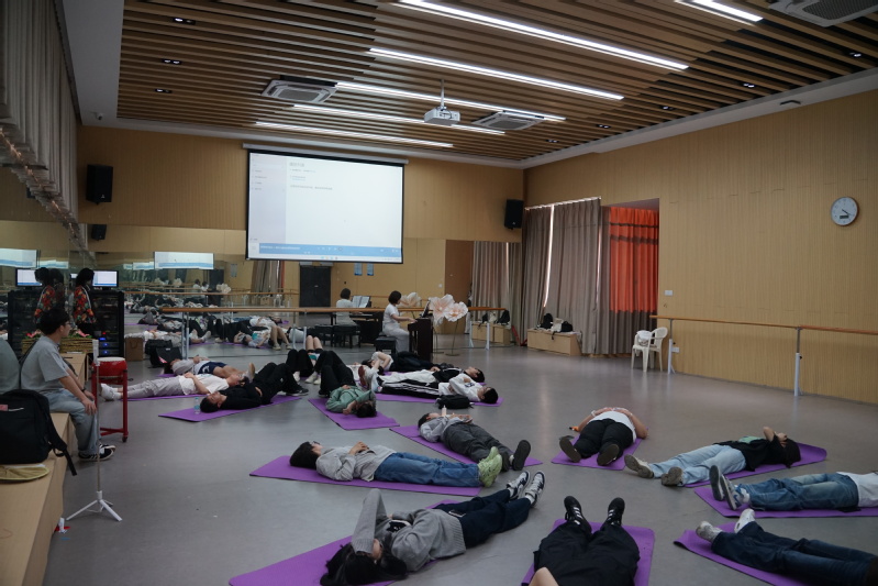活动的最后,万凡捷老师播放了一段温和舒缓的冥想音乐,引导同学们平躺在瑜伽垫上,跟随音乐的节奏进行肌肉渐进式放松。在悠扬的旋律中,大家逐渐放下疲惫,舒缓压力,让身心回归平静。许多同学表示,这种将音乐与冥想结合的方式,让他们感受到了前所未有的放松与安宁。