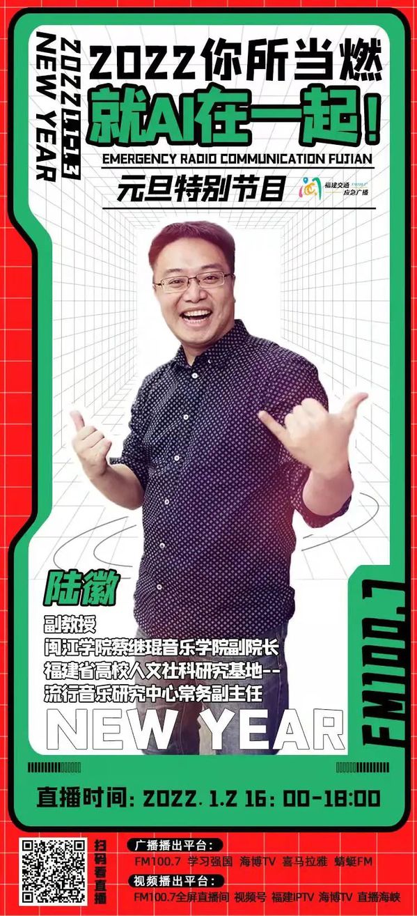 2022年1月2日,必赢76net陆徽副经理,受邀担任100.7福建交通应急广播2022特别企划节目--“2022你所当燃,就AI在一起”音乐艺术主讲嘉宾,在FM100.7调频通过视频直播与广播调频的方式与全省的听众畅聊2021年,展望2022年。