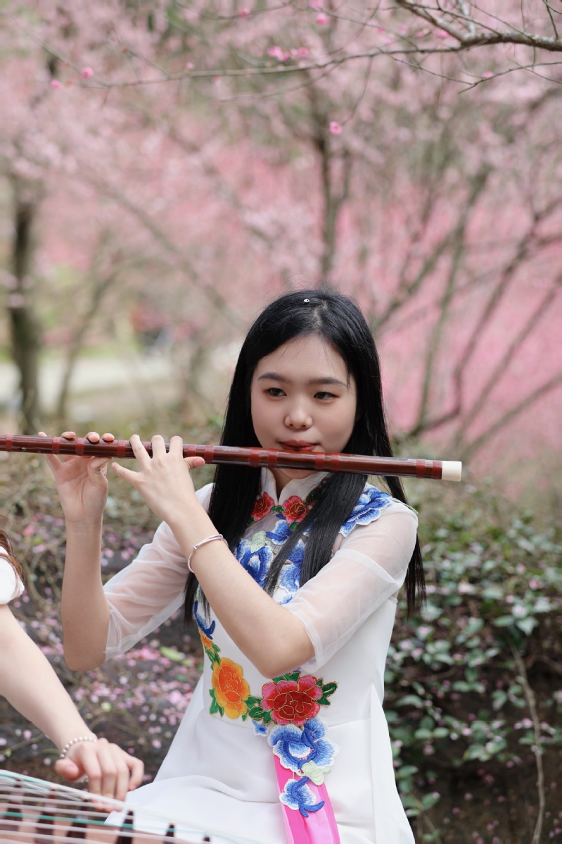 由音乐学院的张婧琪、陈林娟、林心琬、欧阳一心和邵雯组成的乐器表演小分队,分别在景区入口、相怀梅园、古泉跌水、岩梅古台四处设点,为游客带来了扬琴、古筝、琵琶和竹笛演奏,为游客们带来了《兰亭序》、《清明雨上》、《春到湘江》、《海峡音诗》等古典曲目的演奏。琴声、笛声悠长,与山间鸟鸣遥相应和,合奏着林间交响曲,吸引了众多游客一一驻足停留欣赏并纷纷拿出手机拍照、录像、合影。